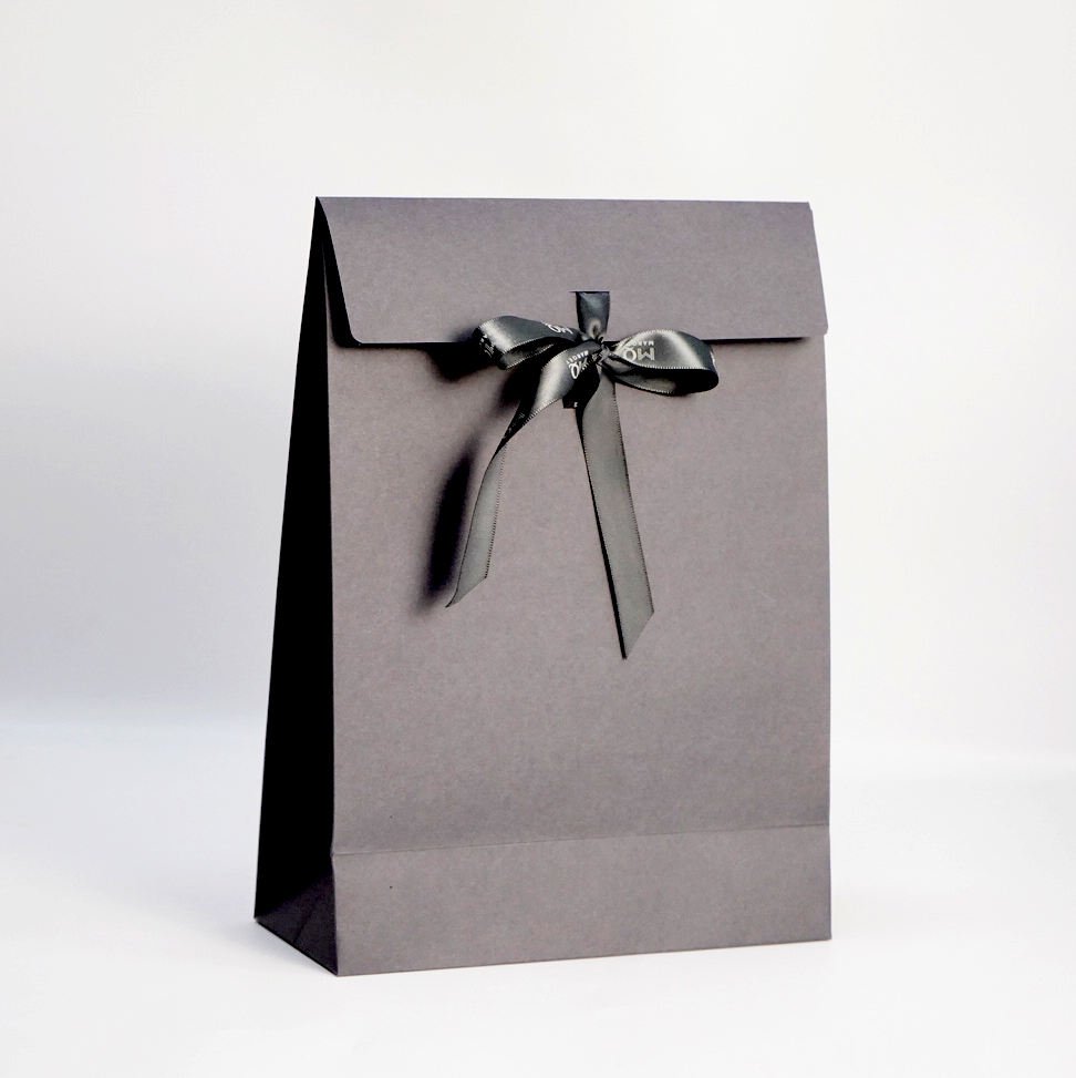 Customized luxury ribbon handle black kraft paper shopping bag.
